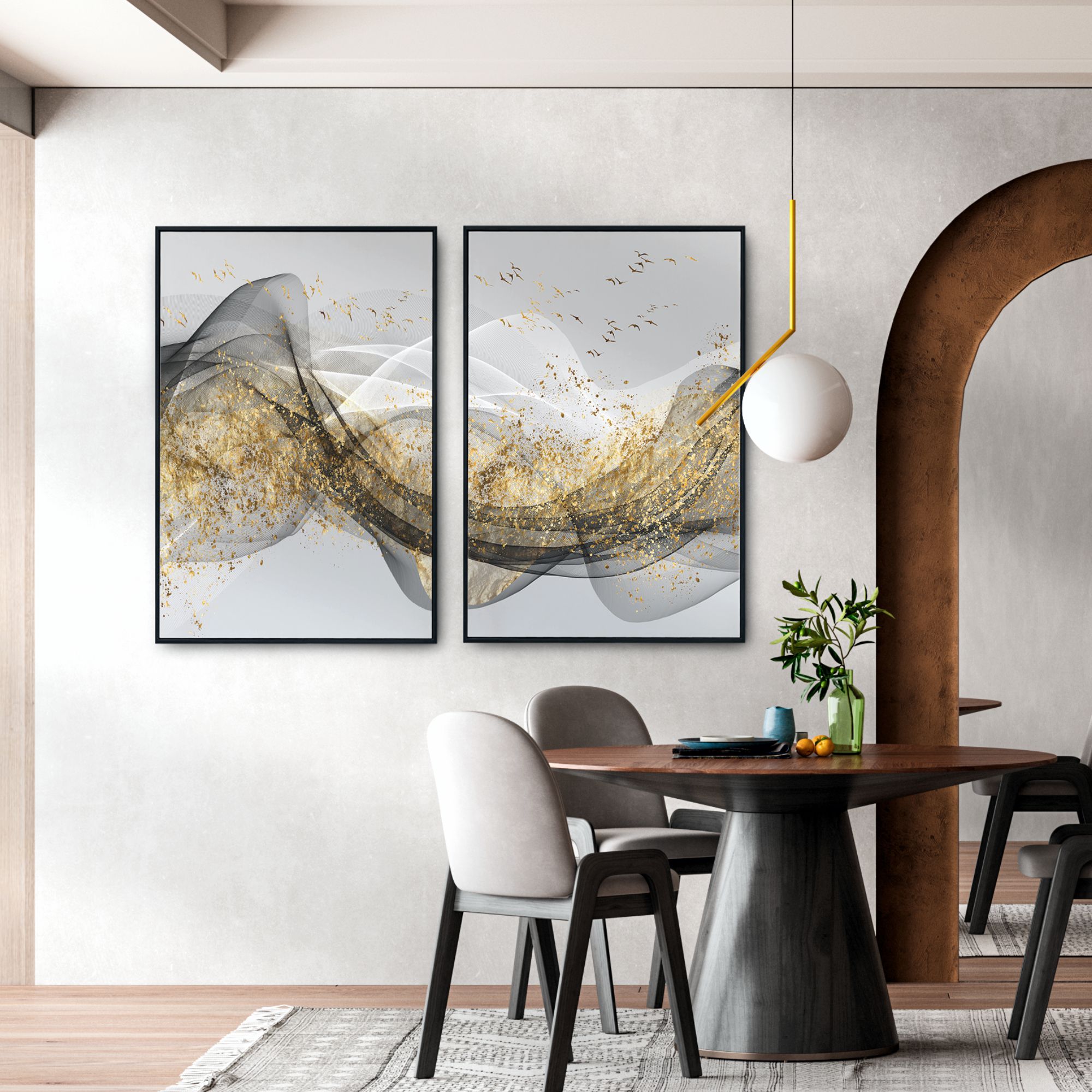 O Conjunto de Dois Quadros - Abstrato Cinza e Dourado é uma adição elegante e moderna para sua casa ou escritório. Com sua impressão HD de alta qualidade, as imagens são nítidas e vibrantes. A moldura de madeira maciça é revestida com acabamento liso, tornando-a durável e resistente ao desgaste ao longo do tempo.